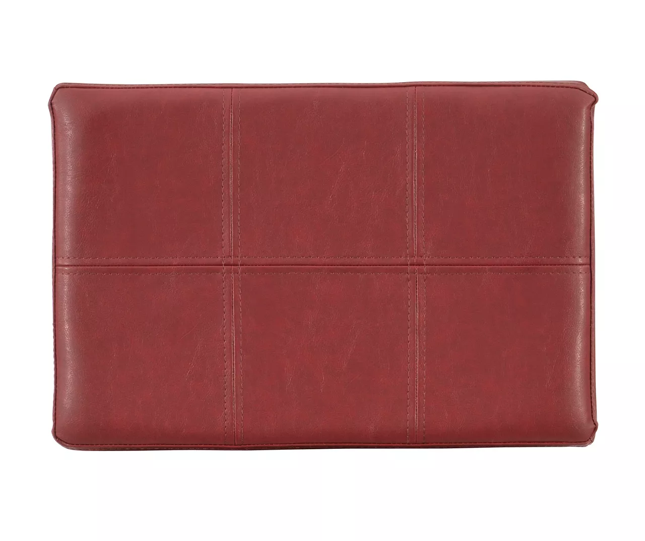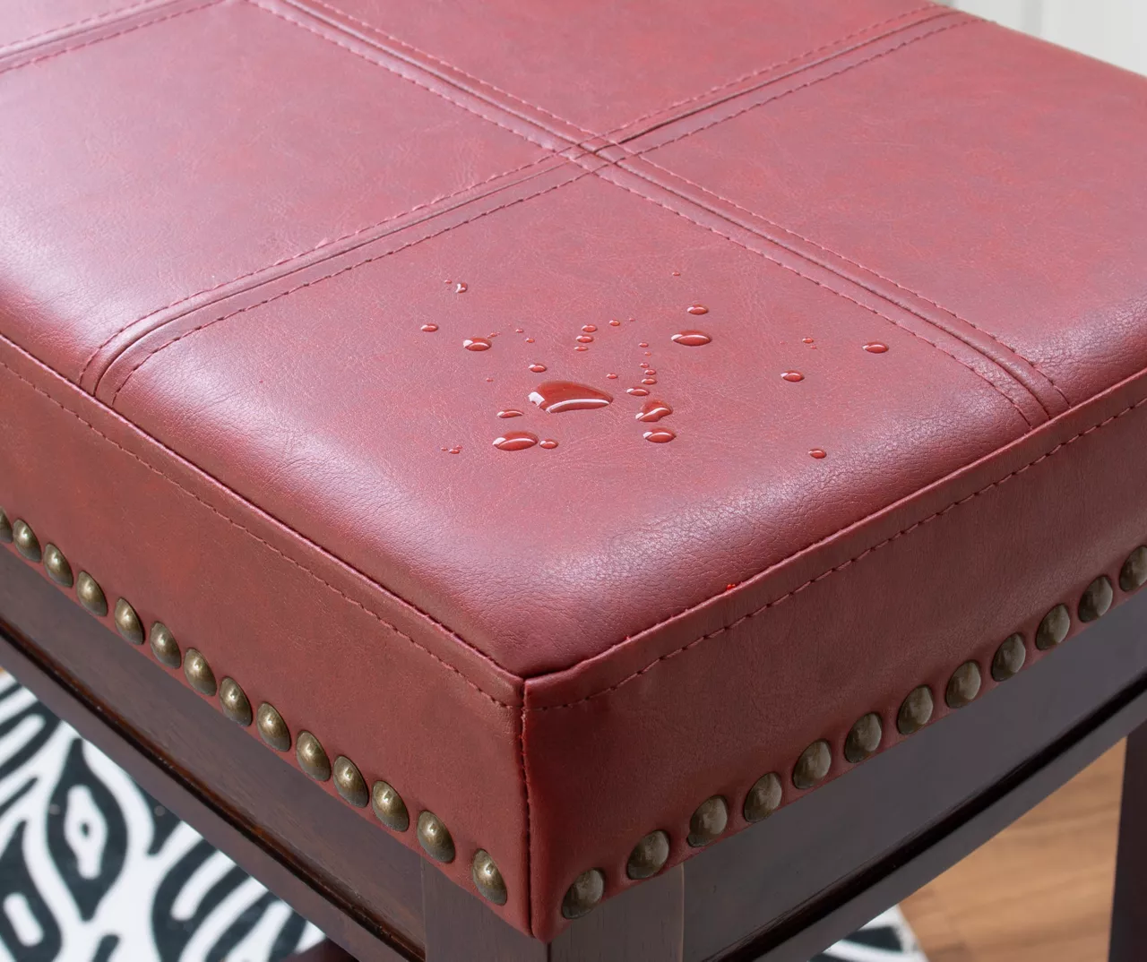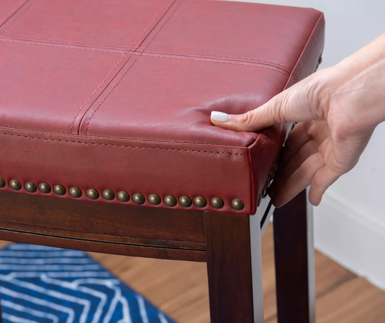 Add stylish seating to any counter or high top table with this stunning bar stool with a red upholstered seat. The sturdy wood frame has a dark espresso finish accented with brushed brass nailhead trim and stitching. The patchwork design on the top provides an extra eye-catching detail.