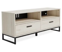 Enjoy your favorite shows and movies in farmhouse fashion using this two-tone Broyhill TV stand. A beautiful brown finish adorns the top surface as the contrasting white base features sliding barn styled doors that move for concealed storage and access to your items. Complete with a large center unit for all your audio, video and media equipment, this TV stand is the perfect addition to a living or entertaining space.