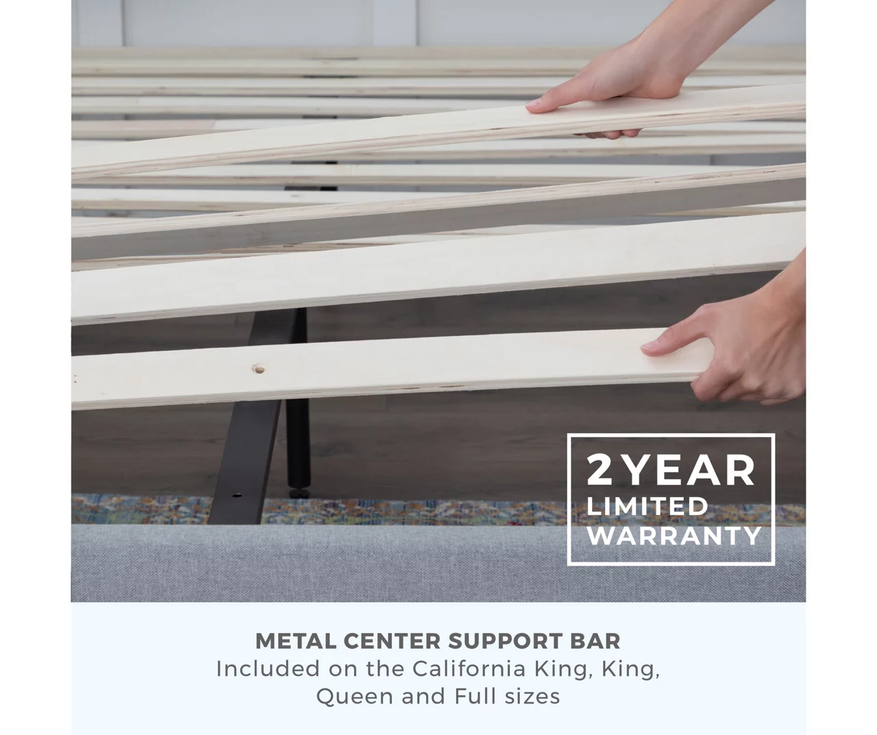 - Includes bed frame, headboard, side and foot rails, legs, 14-piece slat roll and all hardware needed for assembly