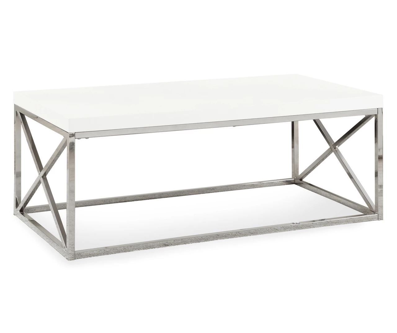 Inspired by clean lines and a simplistic, yet modern feel, this natural wood-look and chrome metal coffee table offers a contemporary allure that will make you feel comfortable in your living room, office space or den. With the smoothest of thick panel surfaces, its pine finish brightens up your living space, while the crisscross chrome metal legs are both sturdy and shiny to complement the table top.